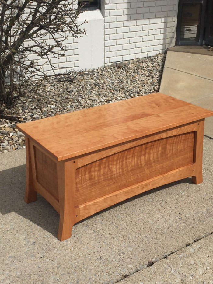 Description: Chest is made with cherry hardwood and figured cherry veneer panels. There are ebony detail plugs. The chest is 40”wide, 19”deep and 20”high. The case has a hand rubbed oil finish and the top is lacquer. SOLD