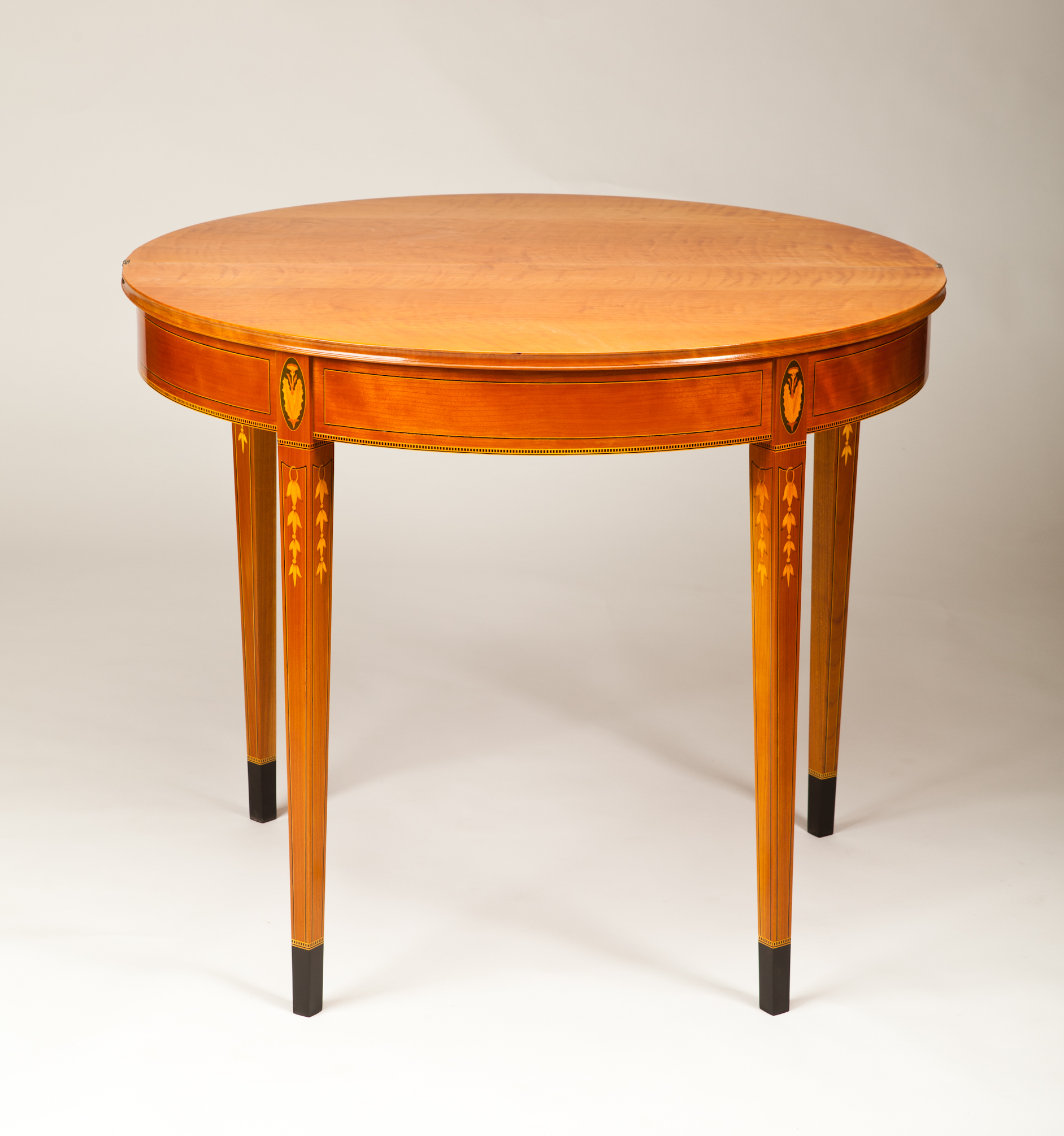 Description: The table is a reproduction from the Federal Period of American furniture (1788-1825). Table is made with cherry hardwood and cherry veneer. There are gate legs that support a folding top. Each leg has white and black stringing, bellflower holly inlays and handmade marquetry.