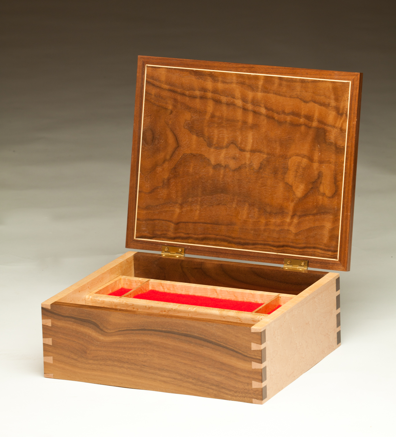 Floral Marquetry Jewelry Box Type: Jewelry Boxes Description: Jewelry Box is made with walnut and birdseye maple hardwood. The top is a veneer marquetry with a floral design. There is a felt lined sliding tray. Share this: Share on X (Opens in new window) X Share on Facebook (Opens in new window) Facebook Email a link to a friend (Opens in new window) Email Related