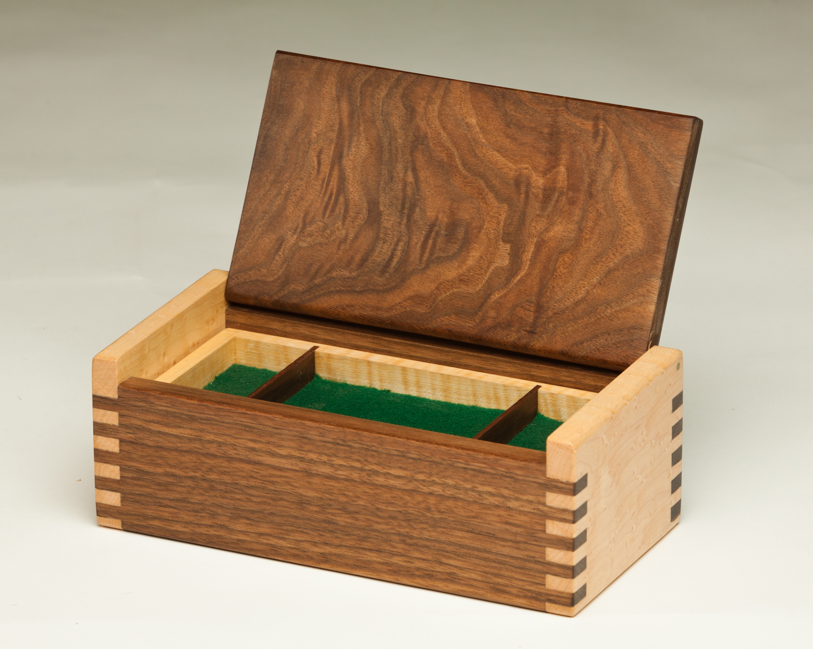 Holly Inlay Jewelry Box Type: Jewelry Boxes Description: Box is made with figured walnut and birdseye maple hardwood. The top features holly fine line stringing. There is also a felt lined tray. Share this: Click to share on X (Opens in new window) X Click to share on Facebook (Opens in new window) Facebook Click to email a link to a friend (Opens in new window) Email Related